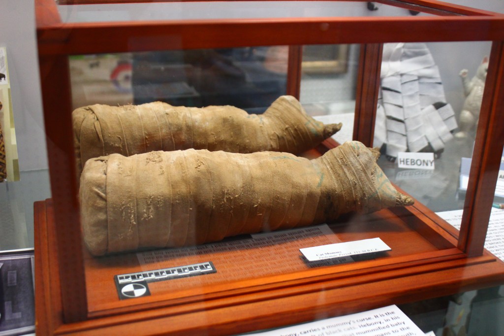 Around the corner from said antique, inside of a vertical glass display case, is an authentic mummified cat from Ancient Egypt that dates back to 332-30 BCE. It’s wrapped up, as though sleeping.