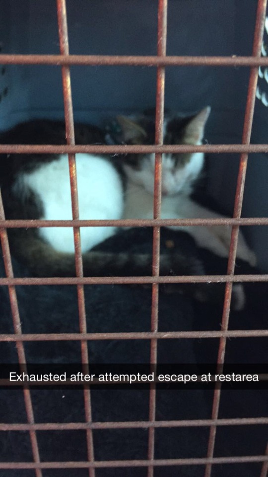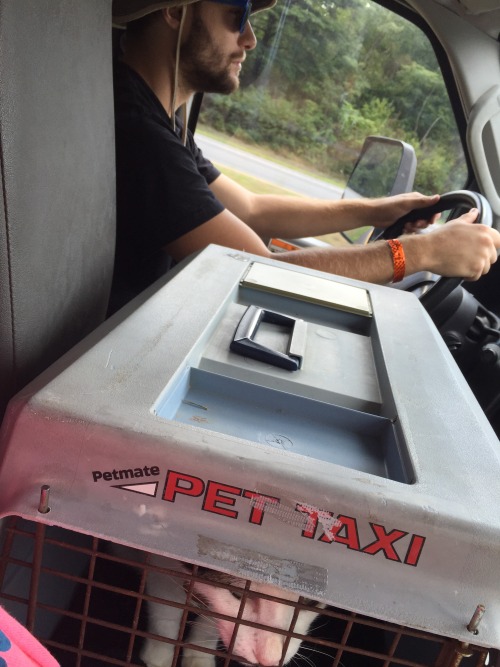 We were rolling along down 81 S with the cab stuffed full of food (gifted to us by Caitlin’s mom, Terry) and fluffy pillows. I drove, Caitlin sat in the passenger seat, and Scottie the cat was riding bitch, as it were, stuffed into a rusty old Pet Taxi. Scottie is, on average, a pretty mellow cat. This has been confirmed by cat lovers and cat haters alike. But when we stopped at a rest area in Tennessee to let him use the bathroom, he betrayed his reputation as one of the chillest felines around.