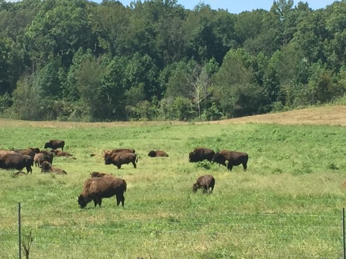 George pulled the truck onto the gravel shoulder. Just beyond the fence line, upon which hung a large sign reading “PLEASE STAND BACK FROM FENCE,” there was a group of 20 to 30 bison soaking in the warm Kentucky rays. Some were just calves. Others were full-grown. By turns they lounged, sniffed one another and used their tails to whip away the flies. Their thick brown coats absorbed the warmth. One particularly young one nuzzled up next to what must have been his mother and closed his eyes to take a nap.