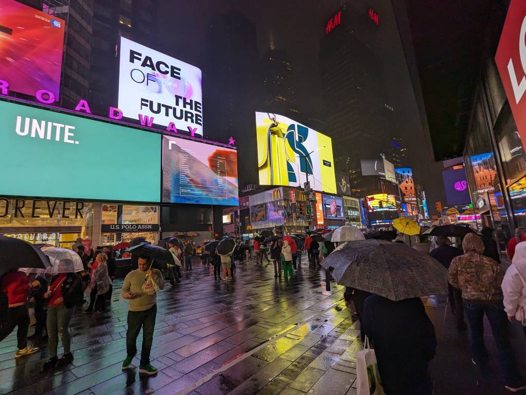 I want to dream a highway back to New York City. All aglow with life and expectation. It’s a rainy night, but the lights from the giant screens are so bright that the water glimmers on the road. Uber drivers honk. A man speaking German stuffs his face with a 99-cent slice of pizza. Many languages are being spoken. It’s a gorgeous, incomprehensible swirl.