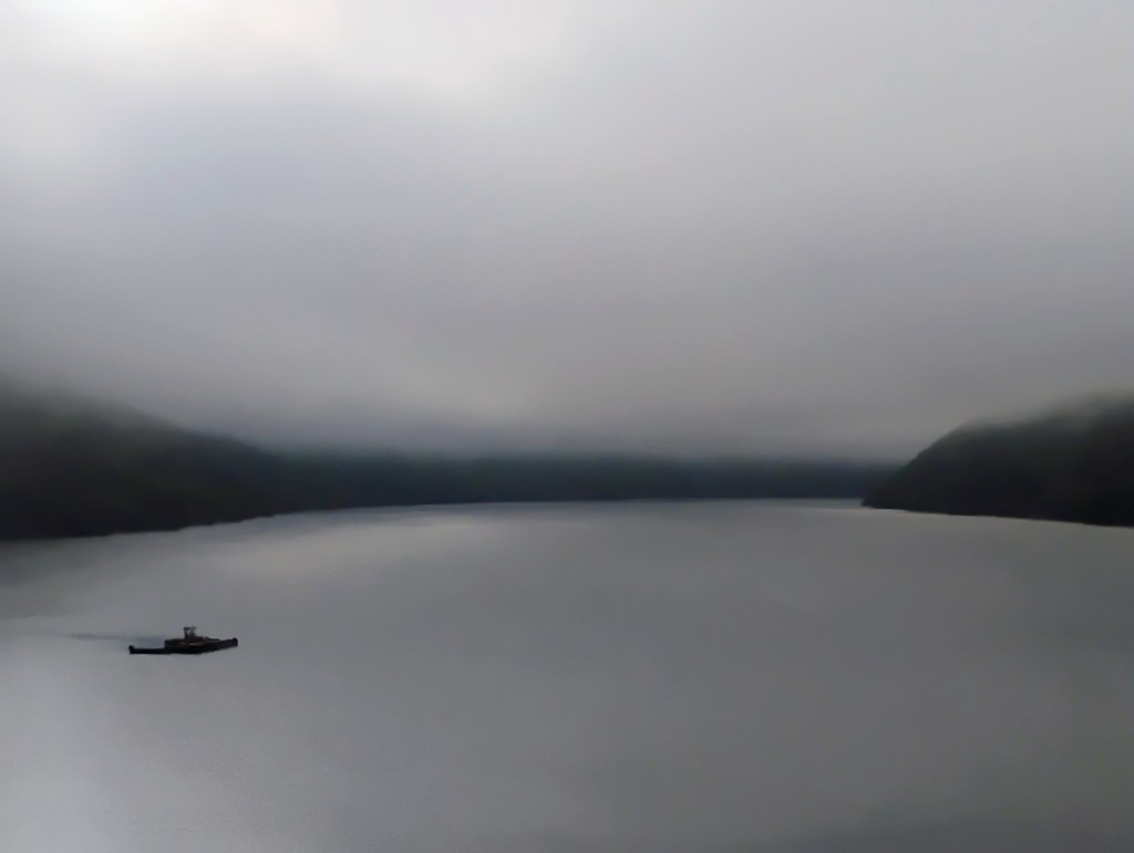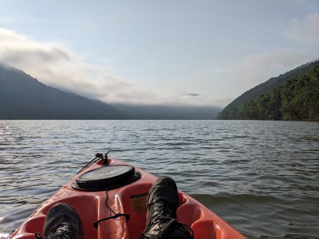 It’s so damn early. The fog is opaque, the air pleasantly cool. I think: why not spend the morning on a kayak in the middle of Bluestone Lake? There’s a marina that rents them at 15 bucks for two hours, and when I arrive, a guy who I presume works there, given the fact that he takes my payment, tosses an oar and a life vest onto the dock and says: “Have at it.” I nearly capsize the hard plastic kayak while climbing aboard; I don’t have an instinct for the weight distribution, and also there are moments in my life, despite being generally athletic, where the communicative tether between my mind and body is severed. My butt gets slightly damp from cold water pooled in the seat, and this makes me irrationally cranky…probably because I haven’t had any caffeine yet, thanks the gray wolf in the loft that wanted to maul my face, and the possibly hungover guy who wouldn’t have given a second thought about blasting a hole in my chest. I manage to pull it together, despite all of these things conspiring against me, and paddle ahead into the wide-open Appalachian lake.