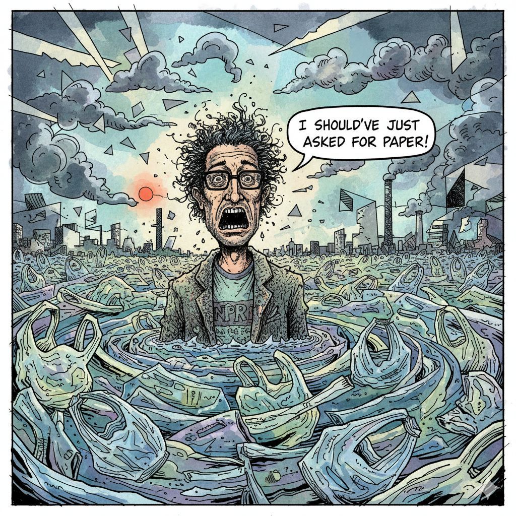 Let me tell you some things about myself: I refuse to ask for paper bags at the grocery store because I don’t want to burden the cashier. This racks me with guilt, because not only am I being a coward, but my cowardice is destroying the Earth, vis-à-vis those plastic bags suffocating baby seals, dolphins, etc. I read somewhere, probably in The New Yorker, that if we continue using plastic bags at our current rate, every inch of the earth will be covered in a 50-foot layer of plastic within five years. We’ll all be blindly flailing around in an infinite plastic bag ocean, thinking to ourselves I should’ve just asked for paper, or at least remembered to grab the reusable ones from the closet by the front door.