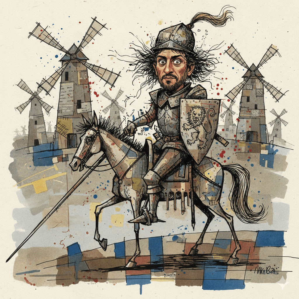 Sancho Panza, confused and severely concussed, had not the faintest recollection of the previous day’s events, and thus no idea what his master was so shrilly hollering about and, in turn, worsening his already devastating headache. So he deferred, as he always did, to blind sycophancy, in an effort to appease what, in his skewed estimation, may have been the one true defender of patriotism left in the land, or at least the most spirited.